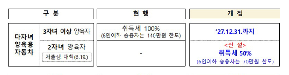 2025년부터 시행되는 다자녀 가구의 자동차 취득세 혜택 변화는 그동안 3자녀 이상 가구에 한정되었던 혜택을 2자녀 가구로 확장(가족관계등록부 기준, 양자 및 배우자 자녀 포함) 하는 중요한 정책입니다. 이는 다자녀 가구의 경제적 부담을 덜어주고, 저출산 문제 해결을 위한 정부의 노력의 일환으로 해석될 수 있습니다.
