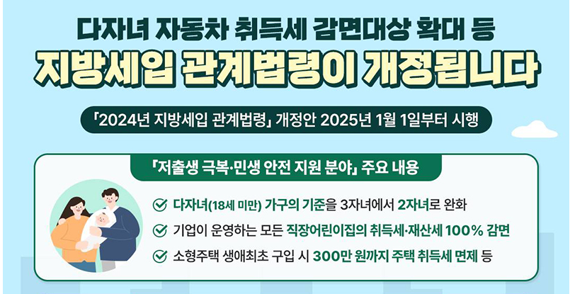 올해부터 자녀가 2명이라도 자동차 취득세 감면 대상이 됩니다. 저출생 극복과 민생 안정을 위한 정부의 노력 중 하나인데요,