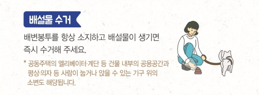 배변을 치우지 않고 그냥 가면 최대 50만원까지 과태료가 부과됩니다. 배설물은 봉투에 담아 집을 가져가야 하며, 아무 데나 버리면 무단투기에 의한 과태료가 추가될 수 있습니다.