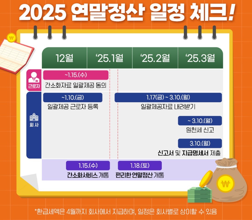2025년 기준으로 연말정산의 주요 일정은 다음과 같습니다.