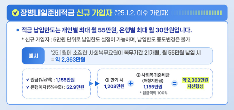 2025년 1월 2일 이후에 신규로 가입하는 장병들은 개인별 최대 월 55만 원, 은행별 최대 월 30만 원까지 납입할 수 있습니다.