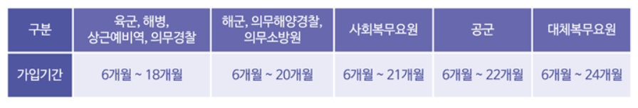 가입대상은 대한민국 병역의무 이행자입니다. 현역병, 상근예비역, 사회복무요원, 전환복무자(의무경찰, 의무해양경찰, 의무소방), 대체복무요원이 대상입니다.