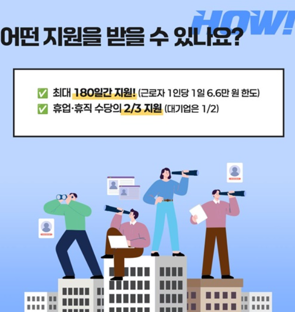 휴업·휴직 수당의 2/3을 지원 (대기업은 1/2 지원)