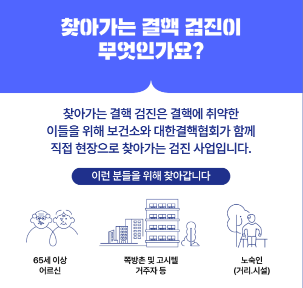 찾아가는 결핵검진사업은 결핵 발병 위험이 높은 취약계층을 대상으로 보건소 및 대한결핵협회가 직접 현장을 방문하여 결핵검사를 진행하는 공공보건 서비스입니다.
