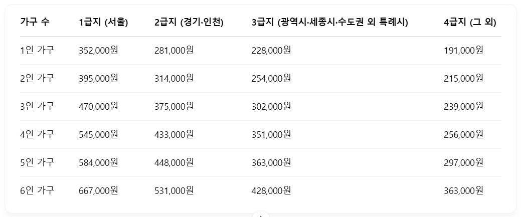 - 3인 이상 가구: 약 47만 원부터 - 광역시 및 수도권 외곽(2급지)