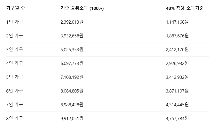주거급여가 불필요하거나, 타 법령 등에 의해 주거를 제공받고 있는 수급자에 대해서는 주거급여를 지급하지 않습니다. 아래 표는 기준 중위소득과 월 소득 기준을 정리한 것입니다.