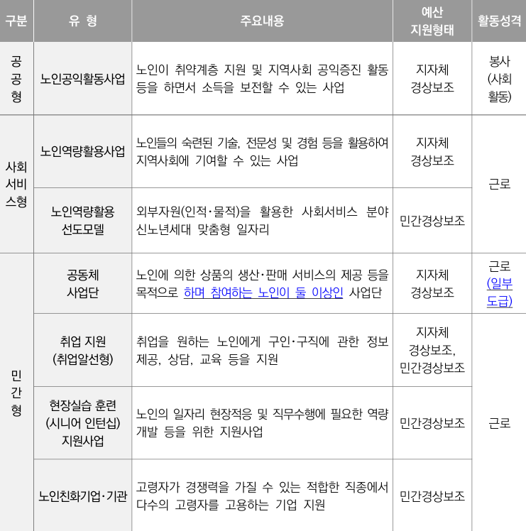 이 외에도 취업알선형, 시니어 인턴십, 노인친화기업 지원 사업 등 다양한 유형이 존재하며, 모두 세부적인 노인일자리 신청자격을 기준으로 참여자를 선발하고 있습니다.