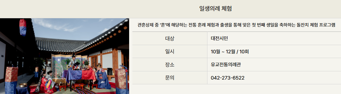 - 일생 의례 프로그램: 전통 혼례, 관례 등의 유교 의례 체험