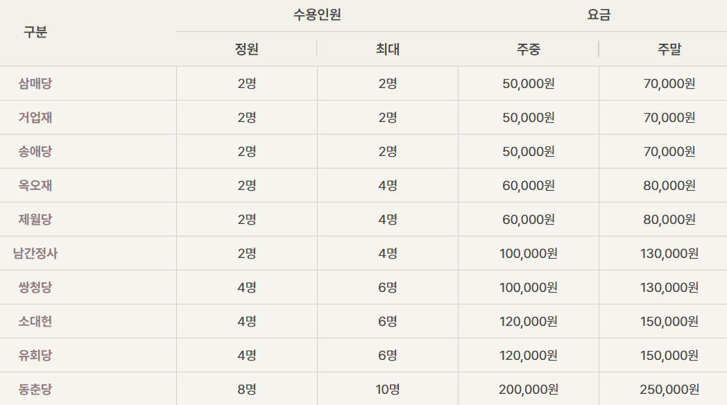 예약 시 선택 가능한 객실은 2인실부터 8인실까지 다양하며, 총 10개 실 중 장애인동을 포함한 7개 동에서 한옥 숙박이 가능합니다. 객실 내부는 전통 한옥 구조를 유지하면서도 현대적인 조명, 냉난방 시설 등을 갖추고 있어 불편함 없이 전통의 정취를 느낄 수 있는 숙박이 가능합니다.