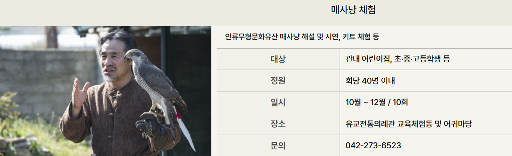 - 매사냥 체험: 유네스코 인류무형문화유산으로 지정된 전통 매사냥