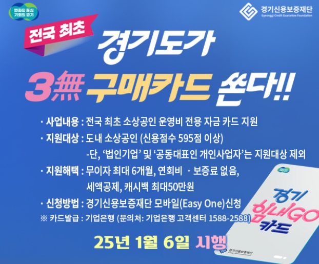 경기도는 2025년도 본예산에 150억 원을 편성하여 소상공인들에게 경기 소상공인 힘내GO 카드를 지원할 예정입니다. 1차로는 1천억 원 규모의 자금을 우선 공급하며, 이후 2차 공급도 진행할 계획입니다. 카드 신청은 1월 6일부터 경기신용보증재단의 모바일앱(Easy One)을 통해 간편하게 할 수 있습니다.