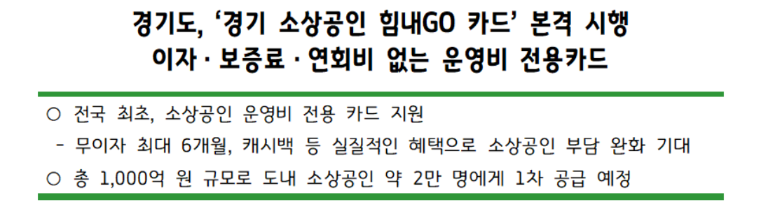 2025년부터 경기도는 전국 최초로 소상공인을 위한 운영비 전용 카드인 '경기 소상공인 힘내GO 카드'를 본격적으로 시행한다고 발표했습니다. 이번 카드 도입은 소상공인들의 경제적 어려움을 해소하고, 자금 부담을 줄이는 목적을 가지고 있다고 합니다.
