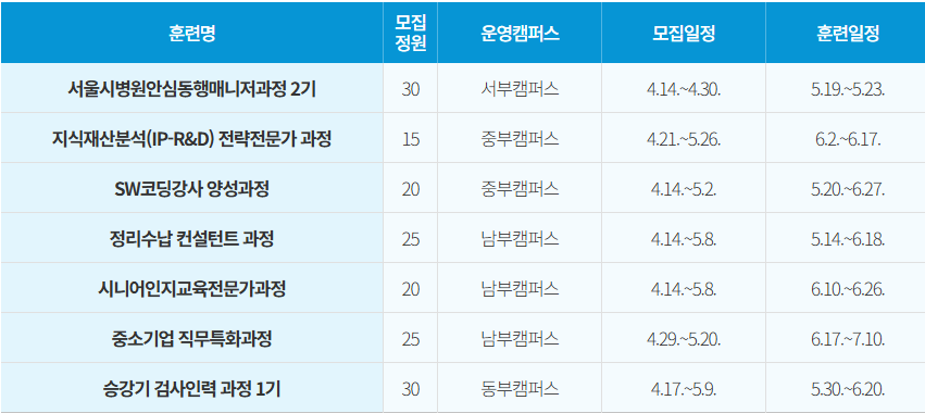 승강기 검사인력 양성과정, 지식재산(IP-R&D) 분석 전략전문가 과정, SW코딩강사 양성과정, 시니어인지교육 전문가과정, 서울시 병원안심동행매니저 과정, 중소기업 직무특화과정 등 직무 특성에 맞는 훈련이 준비되어 있습니다.