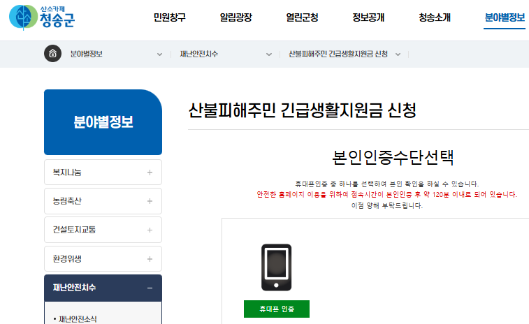 최근 초대형 산불로 인해 생활에 어려움을 겪고 있는 청송군 군민들의 생활 안정과 사회기본권 보장, 그리고 지역경제 활성화를 위해 청송군에서는 청송군 긴급재난지원금을 지급하고 있습니다. 온라인 신청 기간이 짧기 때문에 바로 신청하시길 바랍니다!