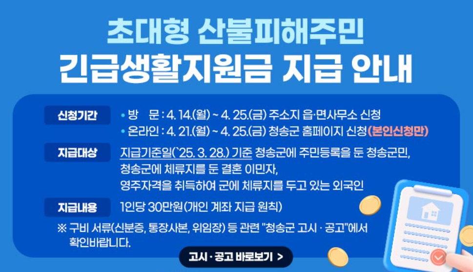 청송군 긴급재난지원금, 산불피해 군민을 위한 긴급생활지원금 안내