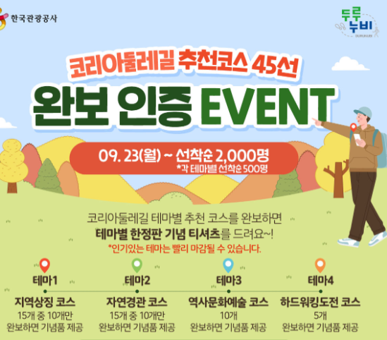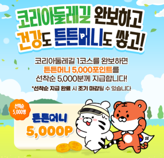 국민체육진흥공단은 코리아 둘레길 1코스를 완보한 참가자 중 선착순 5,000명에게 '튼튼머니' 5,000포인트를 지급하는 인증행사도 진행합니다. 튼튼머니는 스포츠시설 등록이나 스포츠용품 구매, 병원 및 약국에서 사용할 수 있는 포인트로, 국민들의 건강한 생활을 장려하기 위한 스포츠 복지 서비스입니다.