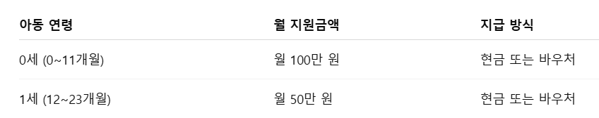 0세 아동은 월 100만 원, 1세 아동은 월 50만 원까지 지원받을 수 있으며, 이를 통해 부모님들은 보다 안정적인 환경에서 아이를 키울 수 있습니다.