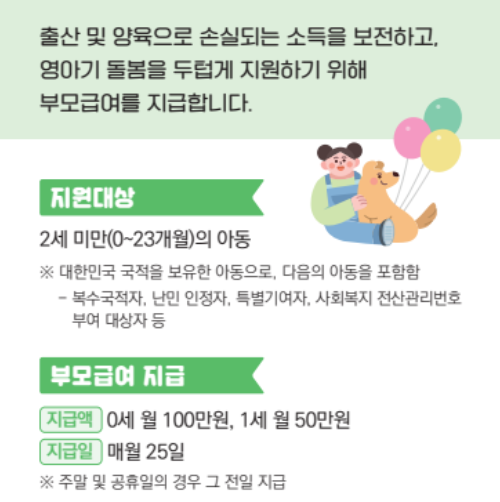 부모급여는 만 2세 미만 아동을 양육하는 가정에 제공되는 정부의 육아 지원 제도입니다. 부모님의 양육 부담을 덜고, 아이들과 더 많은 시간을 보낼 수 있도록 현금 또는 바우처 형식으로 매월 지원금을 지급합니다.