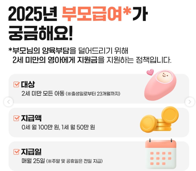 2025년에는 부모급여가 인상돼 0세 월 100만 원, 1세 월 50만 원이 지급됩니다. 아기 양육하면 지출이 크게 늘어나는데 이 지원금이 큰 도움이 되니까 놓치면 안 돼요! 신청하지 않으면 혜택도 0원. 아이가 0세 ~ 1세라면 지금 바로 신청하세요!